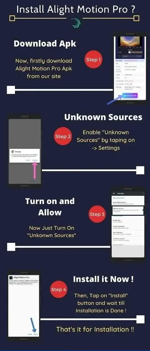 The installation process for Alight Motion Mod Apk is quite straightforward and easy to follow. Simply refer to the graphic image below and follow the steps outlined. Once completed, the Alight Motion Pro should be successfully installed on your Android Smartphone.